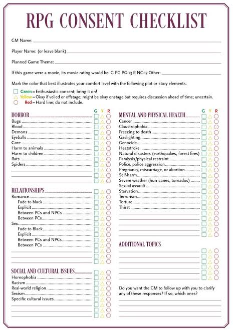 I am currently developing a Consent In Gaming form; a sheet with a list of storyline and gameplay elements that may be confronting or triggering, and players can inform me of these so we can respectfully avoid them in sessions. Forms like this already exist, but as they’re geared for adults, tackle some incredibly challenging topics that aren’t appropriate for children’s groups. So I’ll be making a customised, age appropriate form for my sessions.